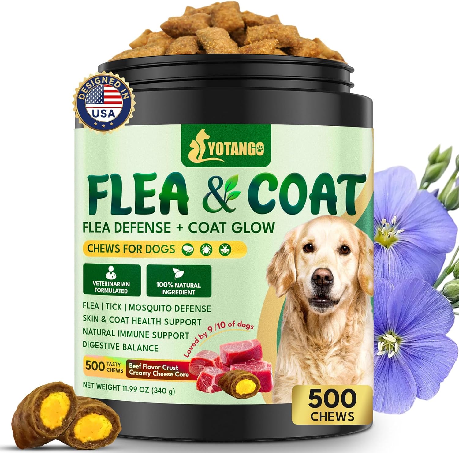 Dog Flea and Tick Support Crunchy & Creamy Chewables, 500 Chews Natural Flea and Tick Support for Dogs Chewable, Skin and Coat Support, Daily Chews for Dogs and Puppies (Beef Flavor)